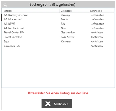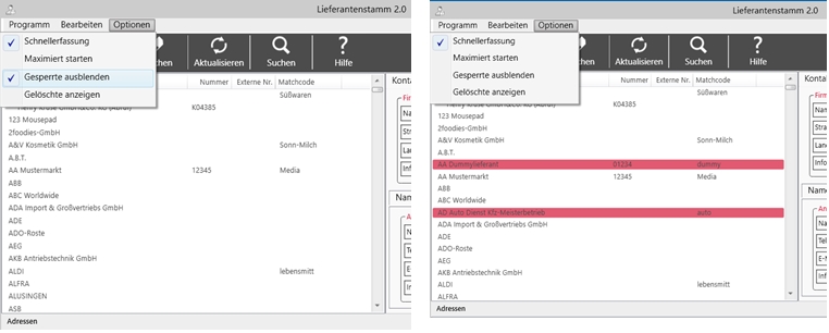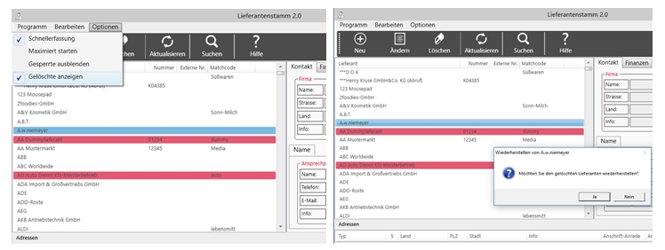 Deleted (archived) suppliers can be displayed again (blue background) and can also be restored by double-clicking.