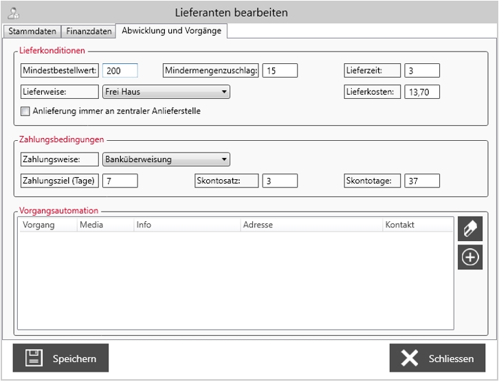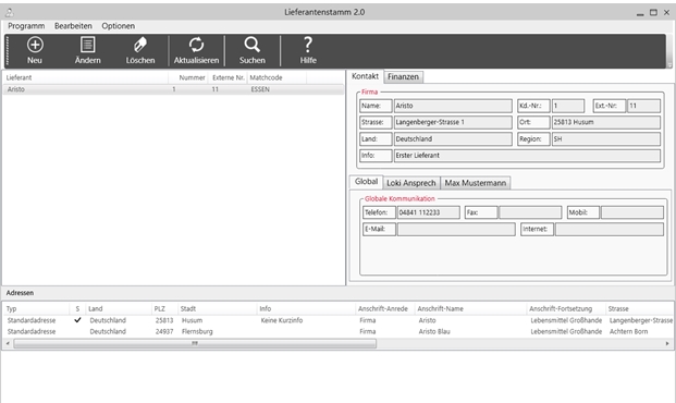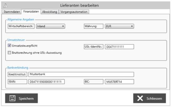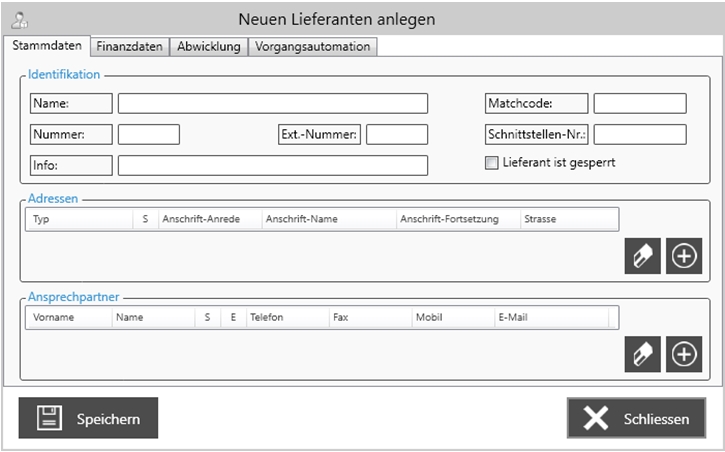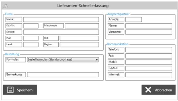 If the fast entry is deselected, the dialog opens in which all details of the supplier can be entered:
