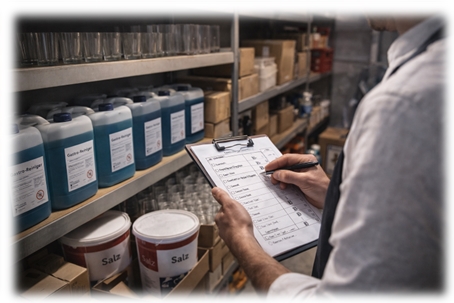 However, simple and feasible checks and automation should be carried out. To this end, it has proven useful to have all items checked (at the latest before a planned order). In these cases, employees record the actual stock, and the difference is posted as consumption on a flat-rate basis. This is not a weakness – it is a conscious system decision.