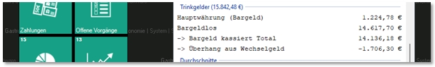 If the non-cash tips received exceed the cash income actually realised, a so-called tip surplus arises. In practice, this is usually settled from the change balance. The financial report itself does not assess whether the available change is sufficient for this. The change stock can be managed and controlled via Wallet Control if required.