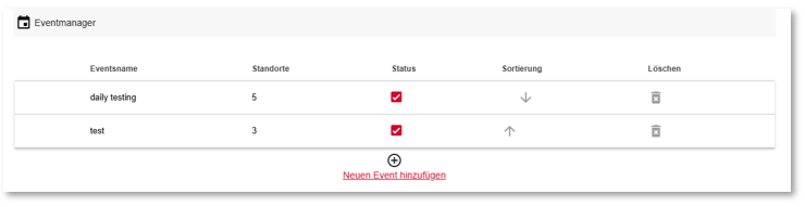 The Event Manager has a table in which all created events are displayed. In this table you can: