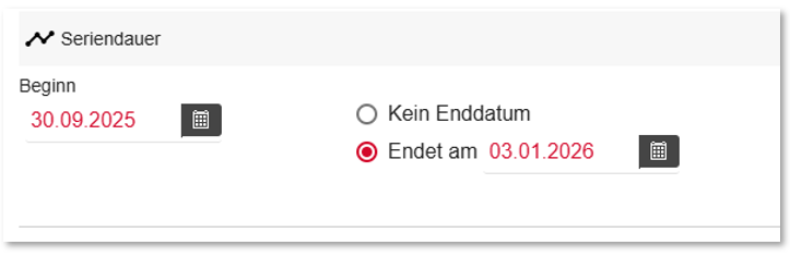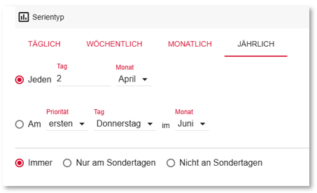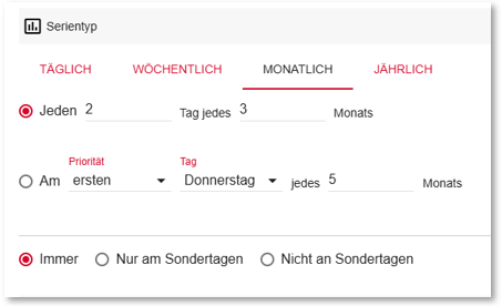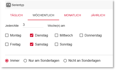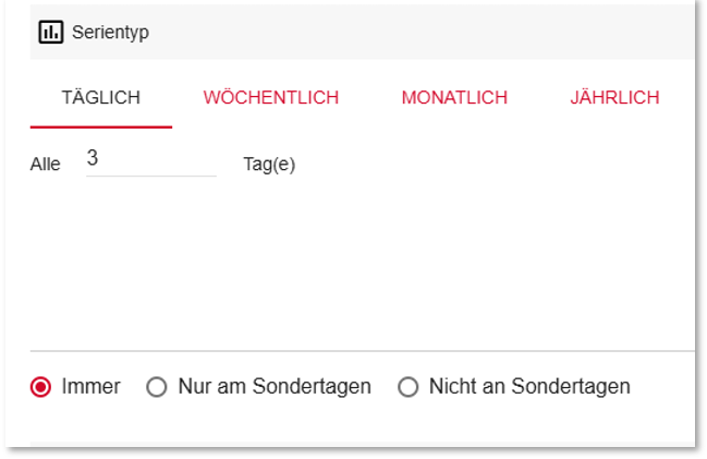 You first select the series interval between daily, weekly, monthly and yearly. Then enter the interval in days (after how many days the event is repeated) for daily, for example.