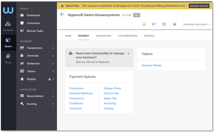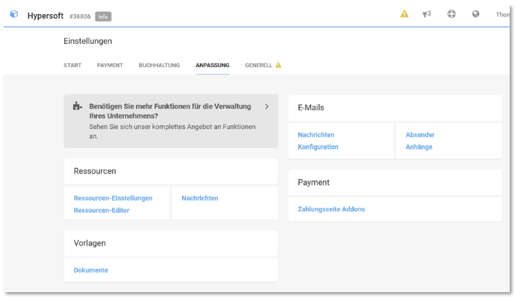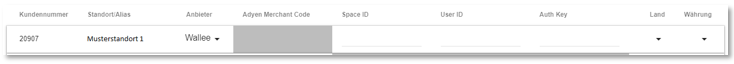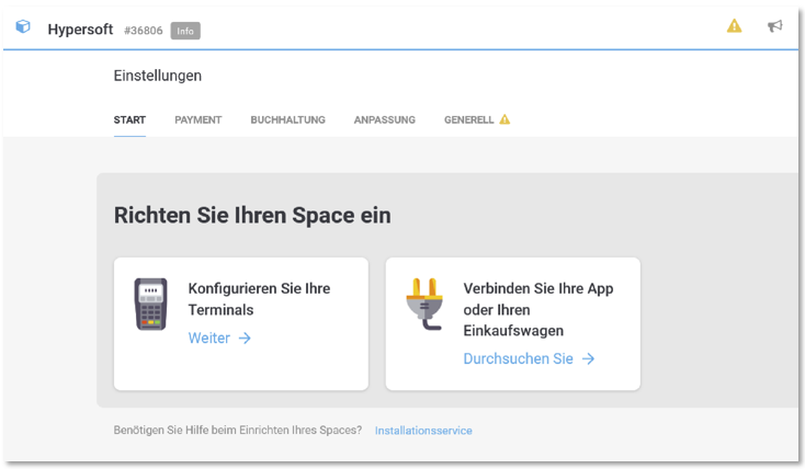Select Dialogue & Access Data in the Hypersoft Portal Setup. In the *YourAPP Setup* (only accessible to Hypersoft employees), the desired payment provider and, in the case of wallee, the Space ID, the User ID and the Auth Key from the wallee portal must be stored for each location.