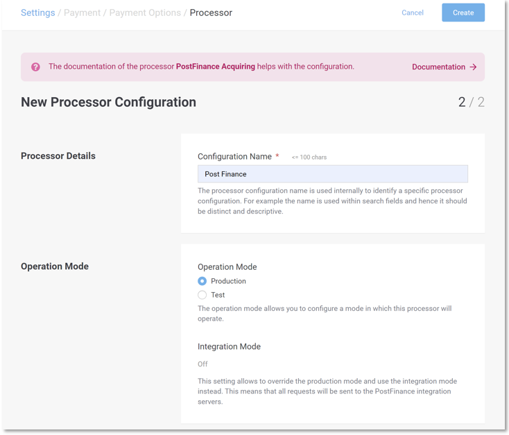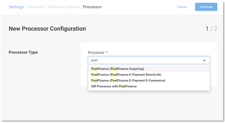 Select PostFinance Acquiring via the search and confirm with Continue: