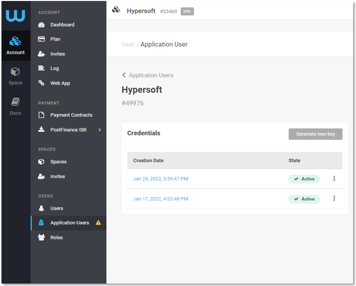 In the wallee portal, the Space ID, the User ID and the Auth Key can be viewed or generated under Account/ Application Users. The entry in Hypersoft is made without the hash "#" in front of the 5-digit number.