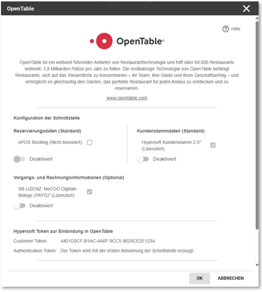 To activate the interface, please ensure that you have the required licences. Please note that if you have several businesses, you must activate the interface to OpenTable for each location.