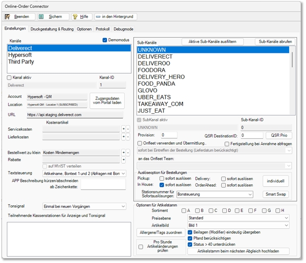 If orders have already flowed into the system via Deliverect, these sub-channels are known and can be displayed using Filter Active Sub-Channels. This allows you to make settings specifically for sub-channels.