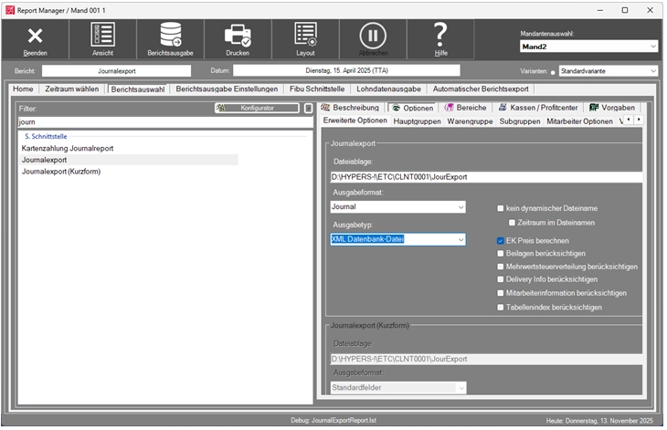 The journal export can be called up with parameters with which an export can be carried out automatically. You can call it up conveniently from the Report Manager via the report Journalexport. You can also create your own calls directly for the program: