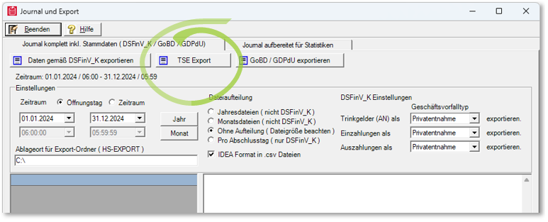 The TSE-only export is used to export only the signature files stored on the technical security device (TSE) in TAR format.