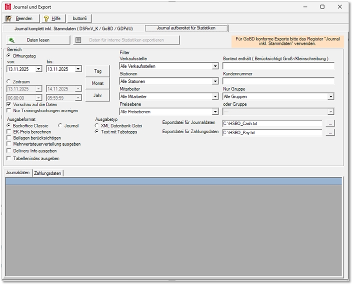 Click on the button Read data and then Export data to create the export files. One file is created for journal data and one for payment data. Please note that processing large amounts of data can take a long time depending on the system; if necessary, avoid exporting large amounts of data at the same time as operating your POS system so as not to reduce the working speed unnecessarily. |