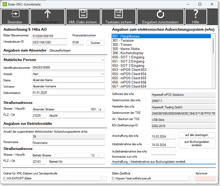 This function generates an XML file that contains all the information required for the message. The taxpayer can log in to ELSTER and upload this file in the corresponding area.