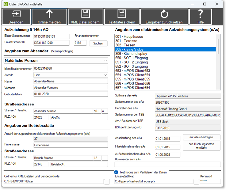 The input is based on the test protocol. The designations in the programme originate from the tax office.