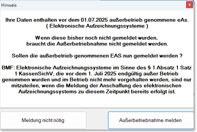 If a decommissioning date before 1 July 2025 is entered for an eAs, a special regulation of the BMF is queried. If the station in question has not yet been registered, it does not need to be "deregistered".