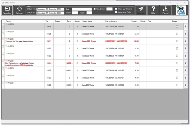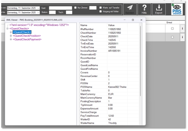 Please note that the programme only receives the confirmation of receipt from the PMS and not all information in the details is validated. If problems occur without a corresponding error message in the PMS Viewer, it may be necessary to compare the data between POS and PMS in addition to an error-free OK status.
