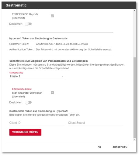 If you have several locations in a central system, you can maintain the Client ID and Client Secret for all locations, but each location can also maintain its own data. The Client ID and the Client Secret can be obtained from gastromatic, enter this information here and press CheckConnection .