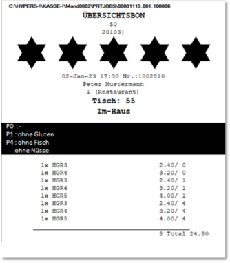 When the order vouchers are printed, TAGs are issued for the respective seats. The TAGs & Characteristics switch from the Order Group Settings controls whether these TAGs are printed on the Order Receipt or not. Highly simplified representation of the TAGs in the header:
